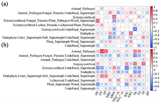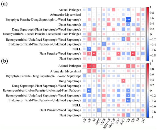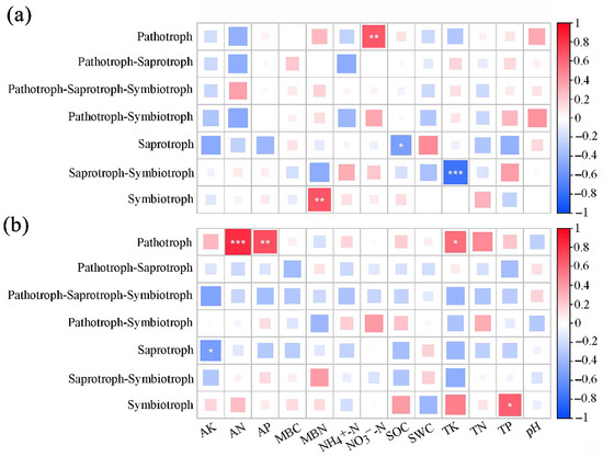 Pearson correlation analysis of relative abundance of functional trophic genes of rhizospheric soil fungi and soil physicochemical factors for sites (a) Shenbaotang and (b) Sanjiaohutang. Note: Red and blue represent positive and negative correlations between two variables, respectively. The darker the color, the closer the relationship, and *, **, and *** represent p < 0.05, p < 0.01, and p < 0.001, same below; AK, available potassium; AN, available nitrogen; AP, available phosphorus; MBC, microbial biomass carbon; MBN, microbial biomass nitrogen; NH4+-N, ammonium nitrogen; NO3−-N, nitrate nitrogen; SOC, soil organic carbon; SWC, soil water content; TK, total potassium; TN, total nitrogen; TP, total phosphorus. * p < 0.05; ** p < 0.01; *** p < 0.001.