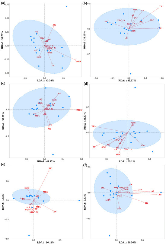 The soil moisture content (SWC) was measured using the gravimetric method (YH-C30002 electronic balance, Sartorius Scientific Instruments, Beijing, China). The pH value was measured using the potentiometric method, with a water-to-soil ratio of 2.5:1, using an ST2100 pH meter (OHAUS Instruments, Shanghai, China). The soil organic carbon (SOC) content was measured using the potassium dichromate oxidation method with external heating. The total nitrogen (TN) content was measured using sulfuric acid digestion followed by the Kjeldahl nitrogen determination method. The contents of ammonium nitrogen (NH4+-N) and nitrate nitrogen (NO3−-N) were measured using the indophenol blue colorimetric method and phenol disulfonic acid colorimetric method, respectively (TU-1901 UV visible spectrophotometer, Beijing Purkinje General Instrument Co., Ltd., Beijing, China). The content of available nitrogen (AN) in soil was determined by alkaline hydrolysis diffusion method. The total phosphorus (TP) content in soil was determined using the sodium hydroxide alkali melting molybdenum antimony colorimetric method (TU-1901 UV visible spectrophotometer, Beijing Purkinje General Instrument Co., Ltd.). The content of available phosphorus (AP) was determined using the sodium bicarbonate/sodium fluoride hydrochloric acid extraction molybdenum antimony colorimetric method (TU-1901 UV visible spectrophotometer, Beijing Purkinje General Instrument Co., Ltd.). The total potassium (TK) content in the soil was measured using NaOH alkali fusion and flame photometry with a TAS-990F flame atomic absorption spectrophotometer produced by Beijing Purkinje General Instrument Co., Ltd. The available potassium (AK) content in soil was measured using ammonium acetate solution extraction flame spectrophotometry with a TAS-990F flame atomic absorption spectrophotometer purchased from Beijing Purkinje General Instrument Co., Ltd. Soil microbial biomass carbon (MBC) and nitrogen (MBN) were extracted using chloroform fumigation and measured by a carbon nitrogen analyzer (Sartorius Scientific Instruments) following the method of Bao [31].