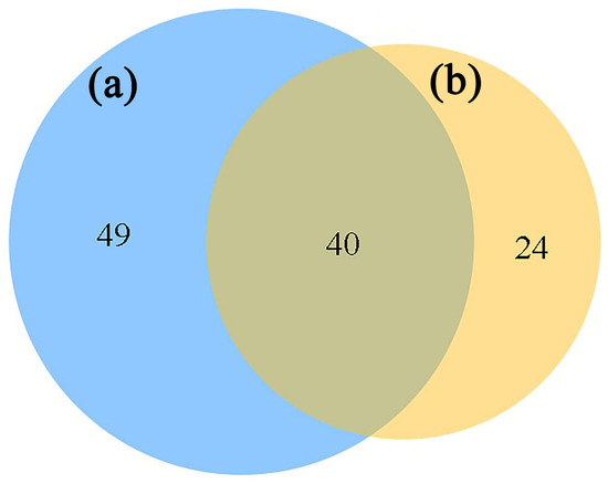 Venn diagram of node distribution in the rhizosphere fungal functional molecular ecological networks for sites (a) Shenbaotang and (b) Sanjiaohutang.