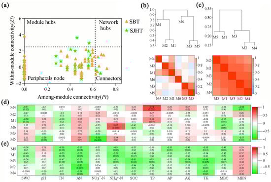 (a) Topological role distribution map of rhizospheric soil fungal functional molecular ecological network (fMEN) nodes sites for Shenbaotang (SBT) and Sanjiaohutang (SJHT), (b,c) hierarchical structure of fMEN modules, and (d,e) their correlation with soil physicochemical properties heatmap. Note: Red and blue in (b,c) indicate high low correlations, respectively; red and green in (d,e) indicate highly positive and highly negative correlations, respectively. Numbers without and with parentheses in each figure represent the correlation coefficient (r) and significance (p), respectively. Mn: Module n for modules 1 to 6.