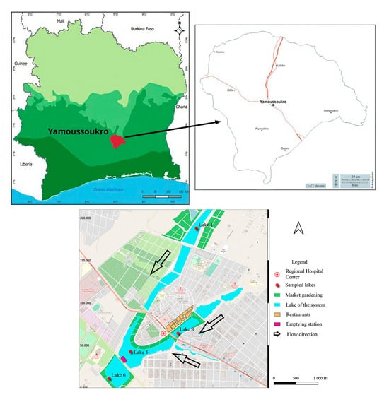 This study has been carried out in Yamoussoukro, in central Côte d’Ivoire (6°40′/7°00′ N and 5°10′/5°20′ W) (Figure 1). This city was created with a system of ten man-made lakes and has been established as the political capital of Côte d’Ivoire since 1983. Connected by gravity, these lakes are an important part of the city’s tourist attractions and cultural heritage. Various human activities are carried out around these lakes, including gardening, livestock farming, restaurant operation, etc. For this study, four lakes within the Yamoussoukro Lake system, which have been previously studied with regard to their microbiological quality [21], were selected. The selected lakes were distributed throughout the system: lakes 1 and 8 are located upstream, at the entrance to the two branches of the system; lake 5 is located in the center of the system; and lake 6 is situated downstream of the system (Figure 1). Sampling was conducted over two dry periods: from November 2021 to January 2022 and from September 2022 to November 2022. For each lake, 1000 mL of water was collected in a U-shaped pattern at a depth of 50 cm [24] at three sampling points. A total of 15 water samples were collected for each lake. In consideration of the vegetable crops cultivated in the vicinity of the lakes, lettuce (Lactuca sativa) was identified as a suitable subject for study. A total of eight lettuce plants exhibiting no apparent deterioration or visible cracking were randomly selected within the proximity of each lake and placed in sterile freezer bags. All the collected samples were placed in a cooler at a temperature of 4 °C and transferred to the laboratory as quickly as possible for further analysis.
