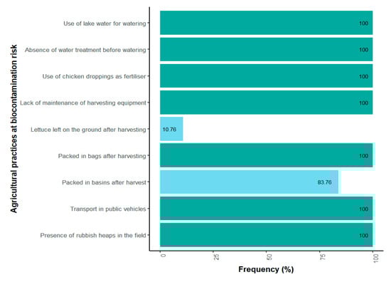 The survey was conducted using a structured questionnaire designed on the KoboToolbox platform and administered during face-to-face interviews with consenting farmers (questionnaire available as follows: https://kf.kobotoolbox.org/#/forms/a7NeSfdb4gbSmwexWfmePo, accessed on the 15 February 2024). The objective was to investigate farming practices that may potentially contribute to the microbiological contamination of lettuce crops by Gram-negative MDR bacteria and the extent to which these producers are aware of the microbiological risks. Thus, a total of 65 lettuce growers were surveyed. The questionnaire encompassed several key themes, including sociodemographic data, irrigation water use, agricultural input practices, and post-harvest hygiene and management.