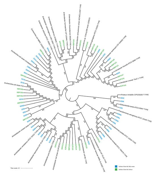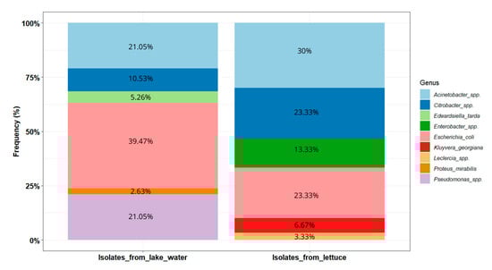 The Shannon diversity index values were 1.51 and 1.44, respectively, for the lake and lettuce samples. The distribution of the isolates within these two types of environments is presented in Figure 5. In the lake water samples (n = 38), E. coli was the most prevalent (39.47%, n = 15). Acinetobacter isolates were the second most prevalent, pertaining to Acinetobacter baumannii (n = 2), Acinetobacter venetianus (n = 2), Acinetobacter vivianii (n = 2), Acinetobacter junii (n = 1), and Acinetobacter lactucae (n = 1). Pseudomonas isolates were closely related to Pseudomonas aeruginosa (n = 4), Pseudomonas putida (n = 2), and Pseudomonas monteilii (n = 2). The Citrobacter isolates are closely related to Citrobacter werkmanii (n = 1) and Citrobacter freundii (n = 1) (Figure 4).