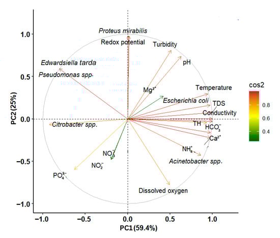 Genera Pseudomonas spp., Edwardsiella tarda, Escherichia coli, and Proteus mirabilis are associated with higher levels of turbidity, pH, Mg2+, temperature, TDS, conductivity, and redox potential, as well as with lower levels of dissolved oxygen. Citrobacter spp. was linked to lower values of TDS, conductivity, NH4+, HCO3−, Ca2+, TH, and temperature. As for Acinetobacter spp., it showed an association with higher TDS, conductivity, NH4+, HCO3−, Ca2+, TH, and temperature, as well as lower dissolved oxygen levels.