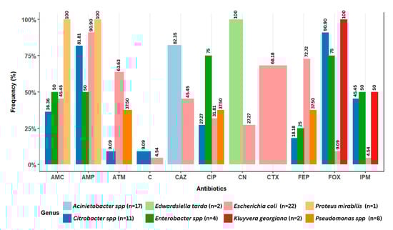 Moreover, the majority of antibiotic resistance observed in this study was confined to the order Enterobacterales. Citrobacter spp. exhibited resistance to cefoxitin (90.9%) and ampicillin (81.8%), and Enterobacter spp. demonstrated resistance to cefoxitin (75%), as they are naturally resistant to these antibiotics [75]. However, resistance to imipenem was also observed in 45.45% of Citrobacter spp. and 50% of Enterobacter spp. Additionally, imipenem resistance was observed in multiresistant strains from these genera. These findings are in accordance with those reported by Duran-Bedolla et al. [76]. Resistance to imipenem is frequently an indicator of carbapenemase multiresistance [77]. Concomitantly, Kluyvera georgiana also exhibited resistance to imipenem (50%), which aligns with recent studies describing its acquired resistance to carbapenems [78,79]. Therefore, further testing is required to confirm the presence of this multiresistance in the isolate in question.
