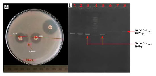 β-lactamase production was confirmed by the synergistic effect observed between ceftazidime (30 μg) and amoxicillin/clavulanic acid (20 μg/10 μg) discs (Figure 8a). ESBL prevalence was found to be 22.05% (15/68). All isolates exhibiting this resistance phenotype belonged to the E. coli species. Ten strains were isolated from lake samples, while five were recovered from lettuce samples. All 15 ESBL-E. coli isolates were found to be positive for blaCTX-M gene presence (100%) (Figure 8b). The blaTEM gene was identified in 11 isolates (73.33%), occurring in conjunction with the blaCTX-M gene. The blaSHV gene was not detected.