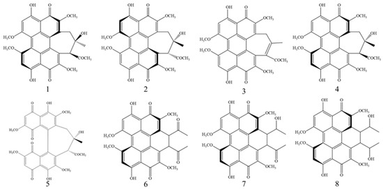 Chemical structures of hypocrellin (1), hypocrellin A (2), hypocrellin B (3), shiraiachrome A (4), hypocrellin D (5), elsinochrome A (6), elsinochrome B (7), and elsinochrome C (8).