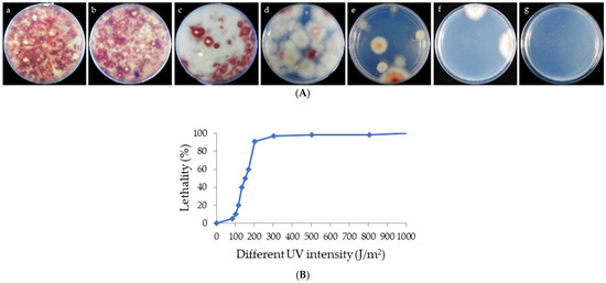 The PDA plates were separately submerged in 10 mL of sterile ultra-pure water (containing 0.02% Tween-80), and the spores were suspended to a concentration of 106 spores/mL [50]. The spore suspensions were then exposed to varying doses of UV radiation (100 J/m2, 120 J/m2, 150 J/m2, 300 J/m2, 800 J/m2, and 1000 J/m2) at room temperature. The distance between the spore suspensions and the UV lamp was 30–40 cm, and these were exposed for 60 s, 90 s, 100 s, 3 min, 8 min, and 10 min separately. After exposure, the spore suspension was uniformly spread onto PDA medium and incubated at 25 °C for 7 days in the dark [36,37,38]. Three independent biological replicates were performed for each treatment.