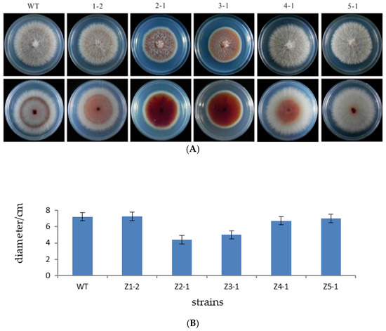 The original strain zzz816 and the mutant strains (Z1-2, Z2-1, Z3-1, Z4-1, and Z5-1) were simultaneously inoculated onto PDA plates and cultured at 25 °C in the dark for 7 days. Colony diameters (Figure 3A) were measured to analyze the growth rates. The growth rates of the mutant strains Z2-1 and Z3-1 were significantly reduced by 39.14% and 30.84%, respectively (Figure 3B).