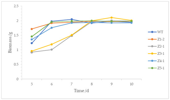 As shown in Figure 5, compared with the original strain zzz816, Z1-2 exhibited a longer fermentation period, with maximum biomass on the eighth day. Z2-1 and Z3-1 also had extended fermentation periods, with the biomass increasing rapidly from the fifth to the eighth day before stabilizing. Z5-1 showed a similar pattern, reaching maximum biomass on the sixth day. Z4-1’s fermentation period remained unchanged, with maximum biomass on the seventh day. Overall, the maximum biomasses of the mutant strains did not significantly differ from the original strain.