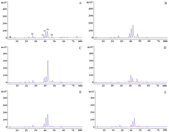 The perylenequinonoid compounds were identified through HPLC analysis (Figure 7), with characterization based on a comparative evaluation of UV–Vis spectra, chromatographic profiles, and retention times against standards [32]. Five sharp peaks were observed in the HPLC chromatogram of the original strain zzz816: elsinochrome B (EB) at 26.331 min, shiraiachrome A (SA) at 38.129 min, elsinochrome A (EA) at 39.955 min, hypocrellin A (HA) at 41.912 min, and hypocrellin B (HB) at 46.808 min.