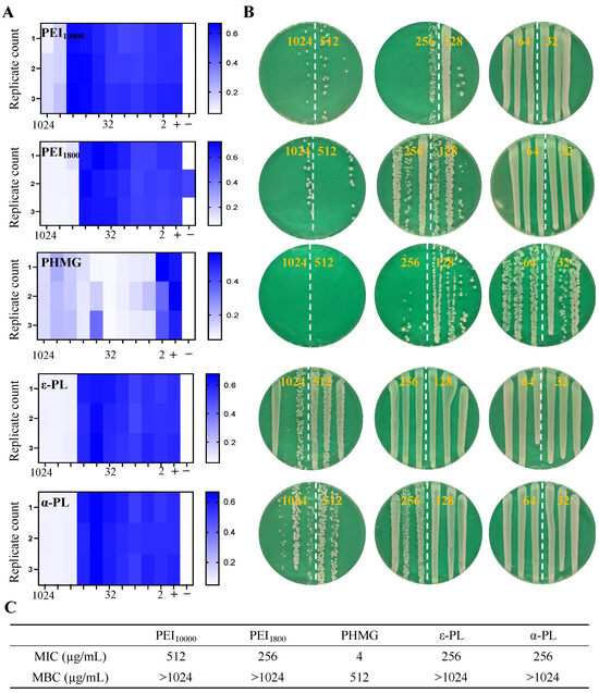 Antimicrobial activity of cationic polymers against MRSA. (A) MIC and (B) MBC determination of cationic polymers against MRSA; the unit of polymeric concentration is µg/mL. (C) Summary of MIC and MBC values.