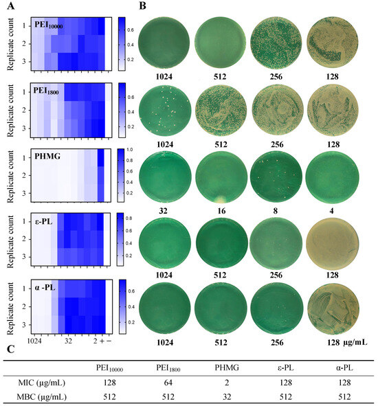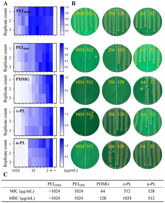 Antimicrobial activity of cationic polymers against E. coli. (A) MIC and (B) MBC determination of cationic polymers against E. coli; the unit of polymeric concentration is µg/mL. (C) Summary of MIC and MBC values.