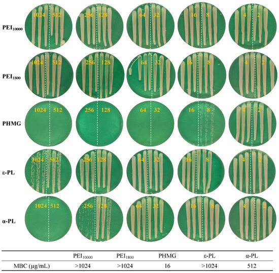 Evaluation of the bactericidal activity of cationic polymers against persistent E. coli (Figure 6) revealed that, among the tested polymers, only PHMG exhibited significant bactericidal effects, completely eradicating the bacteria at 32 μg/mL. In contrast, PEI10000 showed negligible antimicrobial activity, with no difference in bacterial growth. Although precise MBC values were not determined for PEI1800, ε-PL, and α-PL, noticeable bacterial growth inhibition was observed at the highest tested concentration (1024 μg/mL) compared to the control group, indicating that these three cationic polymers possess modest antimicrobial activity against persistent E. coli.