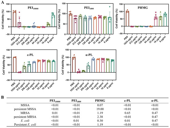 In this study, the clearance efficacy of six cationic polymers against sensitive, drug-resistant, and persistent bacteria was systematically evaluated (Table 1). PHMG exhibited the most potent antibacterial activity, with MBCs ranging from 2 to 512 μg/mL against persistent MSSA, MRSA, and E. coli, significantly outperforming the other polymers tested. Notably, PHMG completely eradicated persistent MSSA subpopulations at concentrations as low as 2 μg/mL, underscoring its exceptional efficacy against metabolically dormant cells. Natural peptide-based cationic polymers, α-PL and ε-PL, also demonstrated notable activity against persistent MRSA, whereas PEIs exhibited modest antibacterial effects, and PAAm showed no activity. Cytotoxicity assays indicated that PHMG and high-molecular-weight PEI10000 induced marked toxicity in mouse fibroblast cells, while α-PL and ε-PL displayed better biocompatibility.