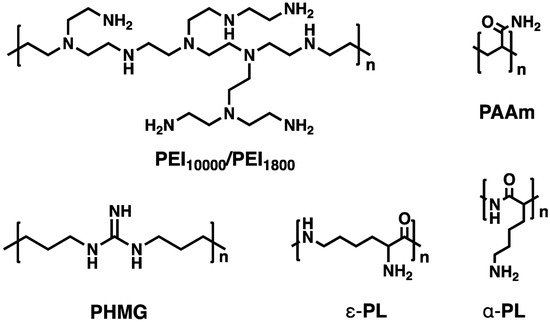 As shown in Scheme 1, five classes of six cationic polymers, including PEIs (PEI10000, MW 10,000; PEI1800, MW 1800), PHMG (MW 533), ε-PL (MW 3600–4300), α- PL (MW 3000–5000), and PAAm (MW 300,000), were selected to study their killing effects on sensitive, resistant, and persistent bacteria. Their structures were confirmed by 1H NMR (Figures S1–S5). These cationic polymers are widely used in antimicrobial materials and drug delivery systems due to their excellent antimicrobial properties [30,34,42]. Although all rely on electrostatic interactions between material surface positive charges and bacterial membrane negative charges, they differ in structural composition, cationic group types, biocompatibility, and bactericidal mechanisms.