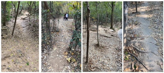Zijin Mountain National Urban Forest Park, located in the northeastern portion of Xuanwu District, Nanjing, Jiangsu Province, China (118°81′–118°88′ E, 32°04′–32°09′ N), has an elevation of 448.8 m. Characterized by a subtropical monsoon climate, it experiences an average annual precipitation of 1530.1 mm and average annual temperature of 19.6 °C, with a frost-free period of 322 days. The experimental site is situated on the southern slope of Zijin Mountain with terrain that is dominated by low hills, which was primarily developed from Jurassic gravelly quartz sandstone, resulting in yellow brown soil. The soil pH ranges from 4.8 to 6.0, is primarily a sandy loam in texture, with a soil bulk density of from between 1.35 and 1.65 g/cm3. The forest coverage rate is 70.2%, with dominant tree species that include Quercus acutissima, Liquidambar formosana, Robinia pseudoacacia, and Ligustrum lucidum. The primary vegetation communities are mixed coniferous and broadleaf forests, deciduous broadleaf forests, and mixed deciduous and evergreen broadleaf forests, along with some artificial bamboo forests, which were mostly formed by years of natural succession. This park shows obvious signs of human disturbances, which have created several elongated forest gaps. The understory includes over 300 bare pathways and patches of varying sizes formed by decades of human trampling, leading to ecological issues such as reduced biodiversity and soil erosion (Figure 1).