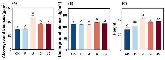 Comparative analysis of ecological restoration measures revealed distinct effects on O. japonicus growth parameters (Figure 2A,C). Microbial inoculant (J) and biochar (C) elicited marked increases in aboveground biomass and plant height relative to the CK, with the J demonstrating optimal performance (p < 0.05). The C group showed the highest underground biomass among all groups, though non-significant (Figure 2B).