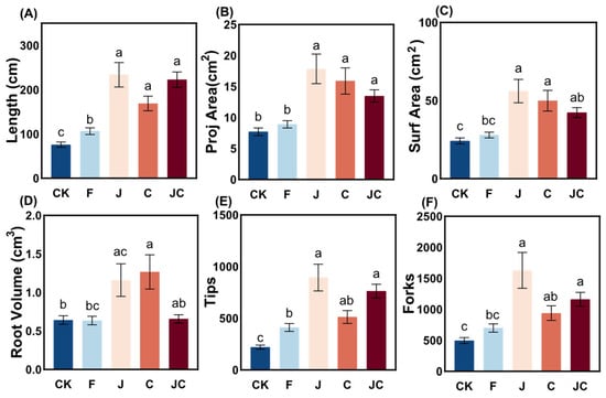 The J and JC treatments showed significant increases in root architectural parameters relative to CK, including root length, projected area, surface area, root tips, and root forks (Figure 3) (p < 0.05). The J and C groups achieved superior root volume compared to CK (Figure 3D) (p < 0.05). Notably, the JC group exhibited lower root volume compared to both J and C groups.