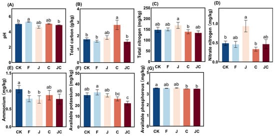 Both J and JC groups exhibited numerically reduced soil pH compared to the CK, though these decreases lacked statistical significance (Figure 4A). The C group significantly elevated total carbon content relative to other groups (p < 0.05; Figure 4B). While the J group showed marginally higher total nitrogen and nitrate nitrogen (Figure 4C,D) than other groups, only nitrate nitrogen (Figure 4D) exhibited statistically significant elevation relative to the CK (p < 0.05). Conversely, soil ammonium nitrogen content (Figure 4E) was numerically greater in CK than the other groups, though non-significant. Notably, the JC group showed significantly reduced available potassium (Figure 4F) and available phosphorus (Figure 4G) concentrations compared to CK (p < 0.05), indicating concurrent depletion of these soil available nutrients.