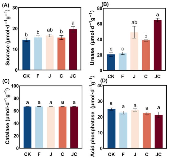 Impact trends of soil enzyme activities under different ecological restoration measures. (A): sucrase; (B): urease; (C): catalase; (D): acid phosphatase; CK: enclosure control; F: ploughing; J: application of B. thuringiensis NL-11; C: application of biochar; JC: application of B. thuringiensis NL-11 + biochar. Different letters indicate significant differences between various restoration treatments (p < 0.05).