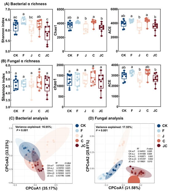 Effect of ecological restoration measures on bacterial (A) and fungal (B) α diversity. Different letters indicate significant differences for each treatment (p < 0.05). Bacterial (C) and fungal (D) community composition were assessed by Constrained Principal Co-ordinates Analysis (CPCoA). CK: enclosure control; F: ploughing; J: application of B. thuringiensis NL-11; C: application of biochar; JC: application of B. thuringiensis NL-11 + biochar.