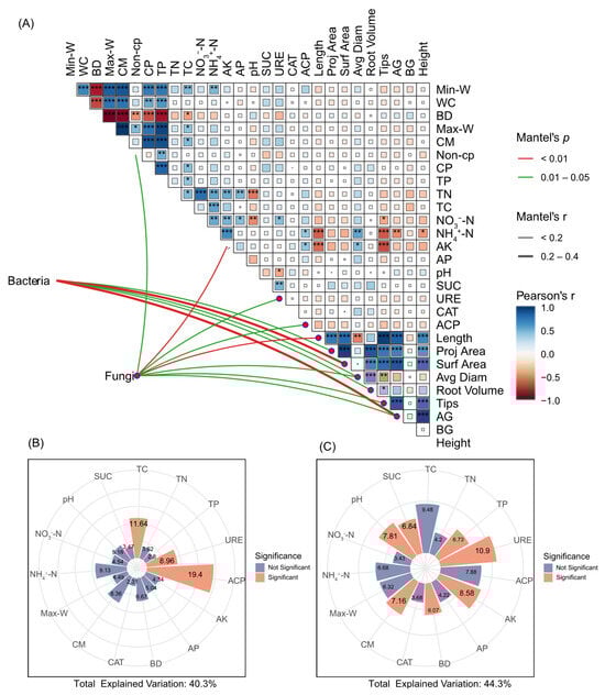 Mantel test shows the relationships between environment factors, O. japonicus growth and soil microbial diversity (A). The main factors affecting bacterial (B) and fungal (C) structure are characterized by hierarchical partitioning analysis, the edge colour denotes statistical significance. Pairwise correlations of these variables are shown via a colour gradient, denoting Pearson’s r correlation coefficients. Significance levels are as follows: * p < 0.05, ** p < 0.01, *** p < 0.001. SOC: Organic carbon; AP: Available phosphorus; AK, available potassium; TN: total nitrogen; TC: total carbon; pH value; SUC: sucrase activity; CAT: catalase activity; ACP: acid phosphatase activity; URE: urease activity; Nit-N: nitrate nitrogen; NH4+-N: ammonium nitrogen; NO3−-N: nitrate nitrogen; length; proj area: projected area; surf area: surface area; avg diam; root volume; tips; AG: aboveground biomass; BG: underground biomass; Height: plant height.