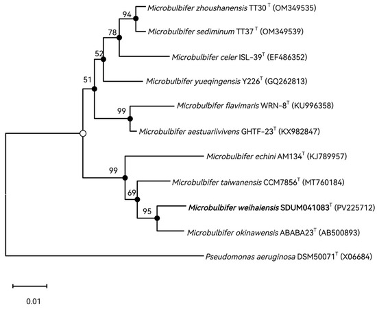 Strain SDUM041083T was isolated from shoal sediments collected from Xiaoshi Island, Weihai, China (37.5° N, 122.1° E) in 2023. The samples were diluted with sterile seawater in five gradients using a standard dilution-plating technique [24], and 0.1 mL aliquots of each dilution were uniformly coated on marine agar 2216 (MA; Becton Dickinson, Franklin Lakes, NJ, USA) and incubated at a constant temperature of 28 °C in an incubator. Single colonies were separated from MA for identification, and finally, the new species SDUM041083T was isolated and stored in sterile 20% (v/v) glycerol supplemented with 3% (w/v) NaCl at −80 °C. The reference strain was identified by 16S rRNA gene sequence comparisons and phylogenetic trees as Microbulbifer okinawensis [11], which can grow on MA media.