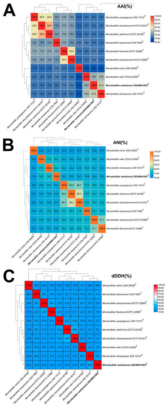 Genomic similarities of strain SDUM041083T to some members of the genus Microbulbifer. (A) The AAI values between species of the genus. AAI: average amino acid identity. (B) The ANI values between species of the genus. ANI: average nucleotide identity. (C) The dDDH values between species of the genus. dDDH: digital DNA-DNA hybridization.