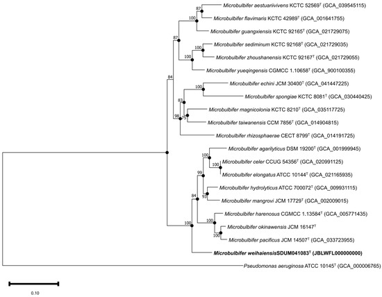 Based on the anti-SMASH results, eleven secondary metabolite biosynthesis gene clusters were predicted in the genome of the SDUM041083T strain, including gene clusters encoding non-ribosomal peptide synthetase-like fragments, mesophenol, Type I polyketide synthase, terpene-precursor, ectoine, non-ribosomal peptide synthetase, NRPS-independent IucA/IucC-like siderophores, terpene, aryl polyene, betalactone, and other unspecified ribosomally synthesized and post-translationally modified peptide products. The ANI value between strain SDUM041083T and Microbulbifer okinawensis was 78.01%, which is below the 95% interspecies threshold [57]; the AAI value was 73.73% and the dDDH value was 22.50%, also below the threshold [58,59]. The ANI, AAI, and dDDH values of SDUM041083T and other strains of the genus Microbulbifer were also lower than the threshold values (as shown in Figure 2), indicating that strain SDUM041083T is a novel species of the genus Microbulbifer. The protein phylogenetic tree, which depicted the evolutionary relationships between strain SDUM041083T and some related type strains, revealed that the strain was affiliated with the genus Microbulbifer (Figure 3), which was consistent with the result of the 16S rRNA gene phylogenetic analysis.