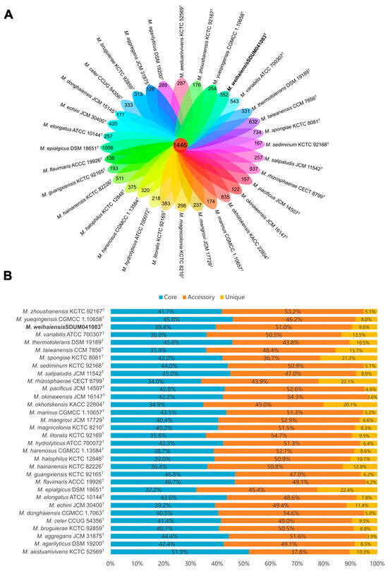 Pan-genome analysis of some strains of the genus Microbulbifer. (A) Venn diagram displaying the number of core gene families and unique genes for each strain. (B) Percentage of core, accessory, and unique genes in each genome.