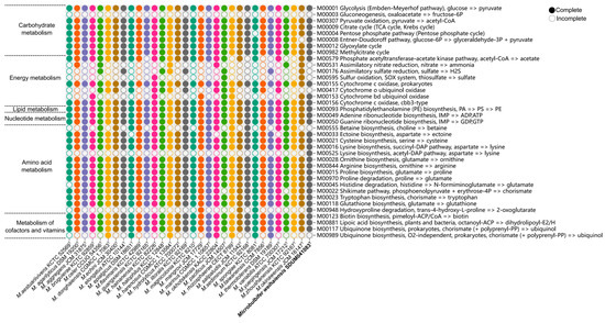 The metabolic module integrity of the genus Microbulbifer. The solid circles and hollow circles indicate that the metabolic pathways were complete and incomplete, respectively.