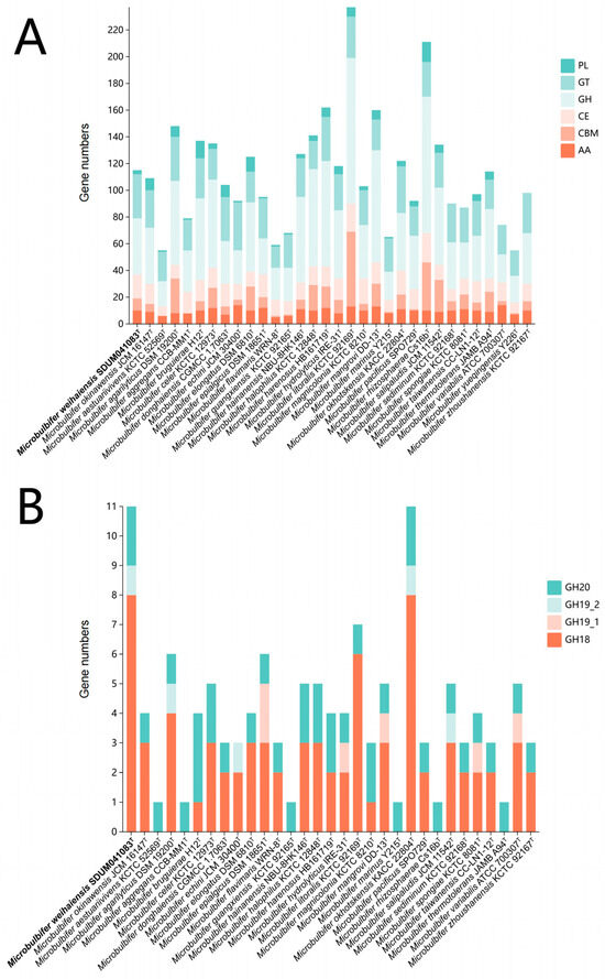 Building upon prior investigations demonstrating the polysaccharide utilization capabilities of Microbulbifer [5,11,12], an assessment of carbohydrate-active enzymes (CAZymes) across 32 strains was conducted (Figure 6A). Different from the research of Long et al. [23], this collection encompassed 31 validly published Microbulbifer type strains and the novel strain SDUM041083ᵀ. CAZyme abundance varied considerably (55–237 enzymes), with glycoside hydrolases (GHs) consistently dominating (e.g., >50% in M. mangrovi) (Figure 6A), aligning with the genus’s known degradative roles [5,11,12,23]. The proportional composition of these enzyme classes varied across individual strains. This enzymatic profile reflects the Microbulbifer genus’s adaptation to multiple ecological niches, such as gut microbiota [55] and aquatic environments [5,7,67], and underscores its evolutionary specialization in key metabolic roles like algal polysaccharide utilization [12] and chitin-degrading [11].