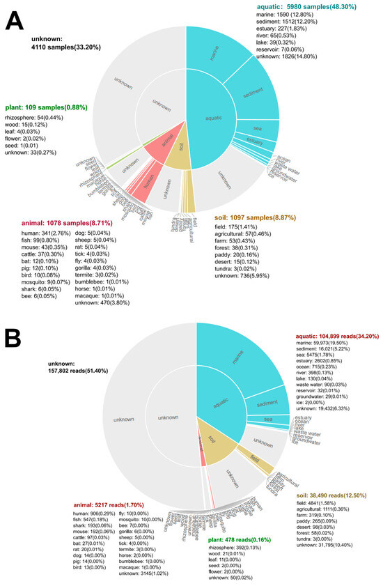 To comprehensively elucidate the global prevalence and habitat range of the genus Microbulbifer, an analysis of this genus’s distribution was performed using the MAP database online. An investigation was conducted on 12,374 samples spanning 2326 projects to pinpoint the characteristic sequence. Microbulbifer sequences were detected in 5980 aquatic (48.30%), 1097 soil (8.87%), 1078 animal (8.71%), and 109 plant samples (0.88%) (Figure 7A). Within aquatic environments, marine habitats (12.80%) and sediments (12.20%) showed the highest prevalence. Furthermore, a comparative analysis of database sequence reads against standard OTUs revealed that Microbulbifer is predominantly enriched in marine environments (19.50% of reads), with sediment environments representing the secondary niche (5.22%) (Figure 7B). This genus-level distribution aligns with the marine origins of most cultured Microbulbifer strains [23].