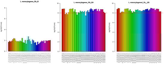 Results of Lm growth rate after inoculation of half Fraser broth (T0, first bar plot) and after 24 and 26 h of incubation, respectively t24 (second bar plot) and t26 (third bar plot). All strains tested (n = 41) are reported on the x-axis, and the y-axis shows the concentration of Lm at different times. Lines in red delimit a growth threshold of 8.0 CFUlog10/mL.