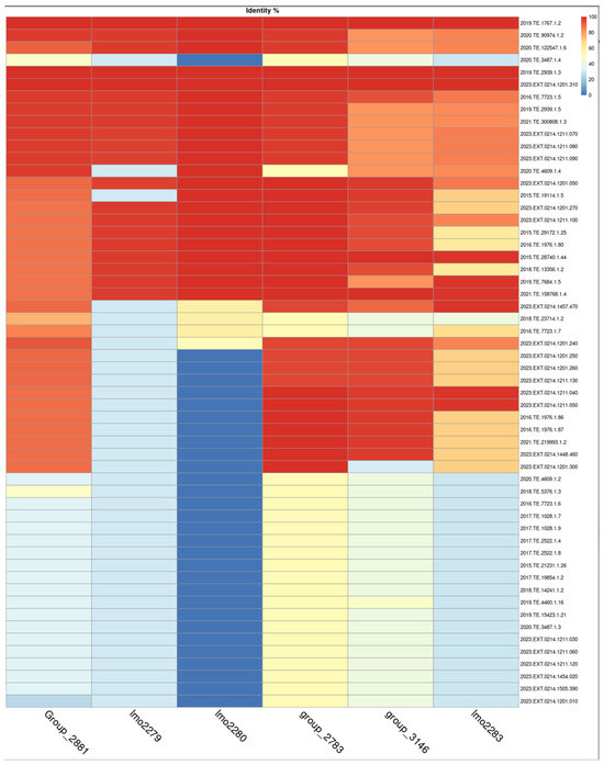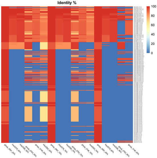 Finally, to evaluate the distribution in different strains of Lm of the cassette genes highlighted as more relevant thorough GWAS analysis (group_2881, lmo2279, lmo2280, lmo2783, group_3146 and lmo2283), more strains of Lm IVb and IIa were analyzed, and BLASTn at different percentages of identity (50%, 70% and 90%) was performed and visualized through a heatmap, Figure 7.