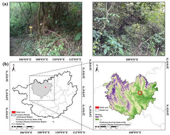 (a) Representative landscape of the experimental plots in the karst shrubland, showing typical vegetation and site conditions. (b) Location of the study area in the Guangxi Zhuang Autonomous Region, China.