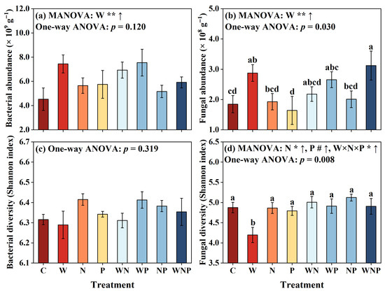 Effects of water (W), nitrogen (N), and phosphorus (P) additions and their interactions on the abundance and diversity of soil bacteria (a,c) and fungi (b,d). MANOVA results are shown above each panel and reflect the effects of individual and interactive factors. The “↑” and “↓” symbols indicate a significant increase and decrease compared to the control based on MANOVA, respectively. Significance levels at # p < 0.1, * p < 0.05, and ** p < 0.01. Different lowercase letters above the bars indicate significant differences among treatments (p < 0.05), as determined by one-way ANOVA followed by LSD tests. C, control; W, water addition; N, nitrogen addition; P, phosphorus addition; WN, water and nitrogen addition; WP, water and phosphorus addition; NP, nitrogen and phosphorus addition; and WNP, water, nitrogen, and phosphorus addition.