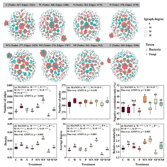 The results of a one-way ANOVA further revealed the specific effects of individual treatments on network topological properties. Compared with the control treatment, the W, WN, and WP treatments significantly increased the number of edges, density, average degree, and relative modularity, while the NP treatment led to a significant reduction in these properties (p < 0.001, Figure 4a,d–f). In addition, the WN, NP, and WNP treatments significantly increased the negative correlation ratio compared to the control treatment (p < 0.001, Figure 4c).