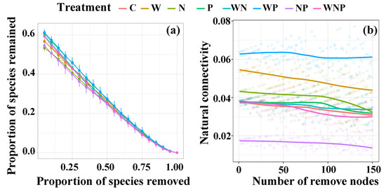 (a) Robustness analysis is shown as the relationship between the proportion of species remaining and the proportion of species removed. (b) Vulnerability analysis is shown as the relationship between microbial natural connectivity and the number of removed nodes. C, control; W, water addition; N, nitrogen addition; P, phosphorus addition; WN, water and nitrogen addition; WP, water and phosphorus addition; NP, nitrogen and phosphorus addition; and WNP, water, nitrogen, and phosphorus addition.