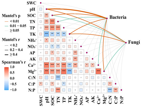 Correlations between the community composition of soil microorganisms and soil physico-chemcial properties. Pairwise comparisons of environmental factors are shown, with a color gradient denoting Spearman’s correlation coefficient. Microbial community composition was related to each soil factor by partial (geographic distance-corrected) Mantel tests. Edge width corresponds to the Mantel’s r statistic for the corresponding distance correlations, and edge color denotes the statistical significance based on 999 permutations. Significant correlations are indicated by symbols (* p < 0.05; ** p < 0.01; *** p < 0.001). SWC, soil water content; pH, soil pH; SOC, soil organic carbon; TN, soil total nitrogen; TP, soil total phosphorus; TK, soil total potassium; NH4+, soil ammonium nitrogen; NO3−, soil nitrate nitrogen; AP, available phosphorus; AK, available potassium; Ca2+, exchangeable calcium; Mg2+, exchangeable magnesium; C:N, soil carbon to nitrogen ratio; C:P, soil carbon to phosphorus ratio; and N:P, soil nitrogen to phosphorus ratio.