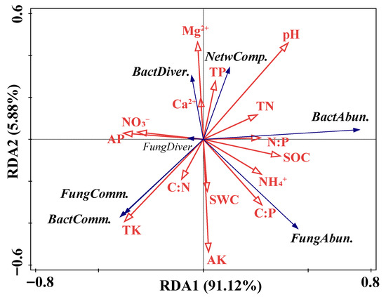 Redundancy analysis with forward selection of microbial abundance, diversity, community composition, and co-occurrence network complexity constrained by the significant (p < 0.05) explanatory variables. SWC, soil water content; pH, soil pH; SOC, soil organic carbon; TN, soil total nitrogen; TP, soil total phosphorus; TK, soil total potassium; NH4+, soil ammonium nitrogen; NO3−, soil nitrate nitrogen; AP, available phosphorus; AK, available potassium; Ca2+, exchangeable calcium; Mg2+, exchangeable magnesium; C:N, soil carbon to nitrogen ratio; C:P, soil carbon to phosphorus ratio; N:P, soil nitrogen to phosphorus ratio; BactAbun., bacterial abundance; FungAbun., fungal abundance; BactDiver., bacterial diversity; FungDiver., fungal diversity; BactComm., bacterial community composition; FungComm., fungal community composition; and NetwComp., co-occurrence network complexity.