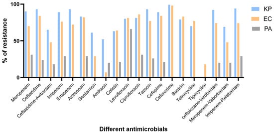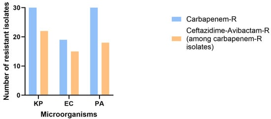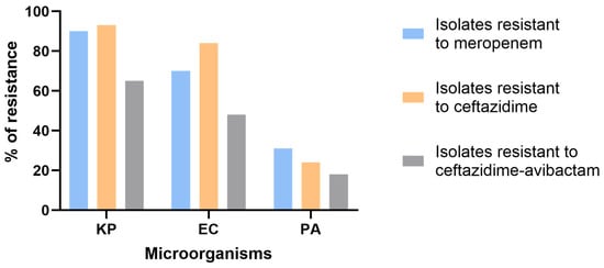 Percentage of isolates resistant to meropenem, ceftazidime, and ceftazidime–avibactam. KP: Klebsiella pneumoniae; PA: P. aeruginosa; EC: Escherichia coli.