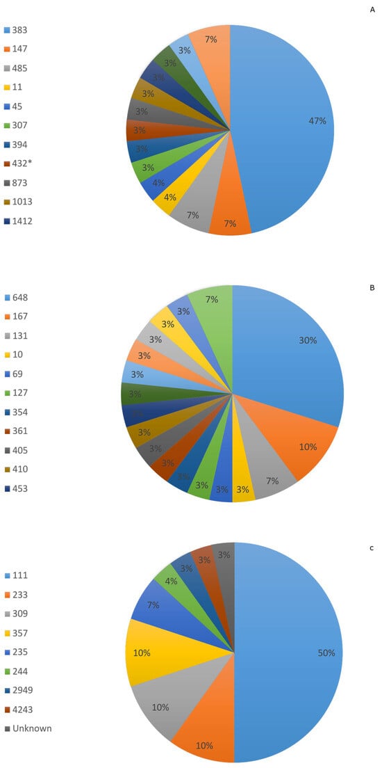 Distribution of sequence types (STs) among clinical isolates of (A) Klebsiella pneumoniae, (B) Escherichia coli, and (C) Pseudomonas aeruginosa; * is provisional or unassigned sequence type.