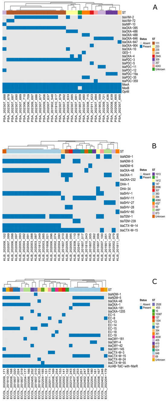 Heatmap representing the distribution of key antimicrobial resistance genes across different isolates of various sequence types. The AMR genes represented contribute to resistance against beta-lactams, cephalosporins, cephamycins, and carbapenems, as well as ceftazidime–avibactam. (A) P. aeruginosa sequenced isolates, (B) K. pneumoniae sequenced isolates, (C) Escherichia coli sequenced isolates.