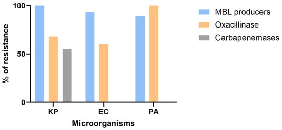 Moreover, the rates of resistance to meropenem among sequenced isolates were as follows: 30 out of 30 (100%) for K. pneumoniae, 19 out of 30 (63%) for E. coli, and 30 out of 30 (100%) for P. aeruginosa isolates. Among those, 22 out of 30 (73%) K. pneumoniae, 15 out of 19 (79%) E. coli, and 18 out of 30 (60%) P. aeruginosa isolates were resistant to ceftazidime–avibactam (Figure 5). Furthermore, the percentages of isolates harboring metallo-β-lactamase genes among sequenced carbapenem and CAZ-AVI-resistant isolates were as follows: 22 out of 22 for K. pneumoniae (100%), 14 out of 15 for E. coli (93%), and 16 out of 18 for P. aeruginosa (89%). Additionally, 15 out of 22 K. pneumoniae (68%), 9 out of 15 E. coli (60%), and 18 out of 18 P. aeruginosa isolates (100%) were oxacillinase producers, of which 55% (12 out of 22) of K. pneumoniae isolates encoded carbapenemases (blaOXA-48, blaOXA-232) (Figure 6). Notably, some K. pneumoniae isolates harbored both MBL and OXA-type carbapenemases, indicating co-occurrence of multiple carbapenemase genes within the same strain.
