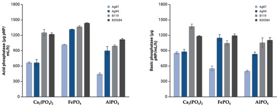 Considering strains Ag87 and Ag94, the highest mean activity for acid phosphatases were obtained with Fe(PO4), whilst highest mean activity of basic phosphatase was obtained with Ca3(PO4)2. Nonetheless, basal phosphatase activity was recorded sustaining a minimum of 400 µg pNPP mL−1 h−1 for Ag87, but capable of reaching up to 900 µg pNPP mL−1 h−1 when considered with Al(PO4) in both cases.