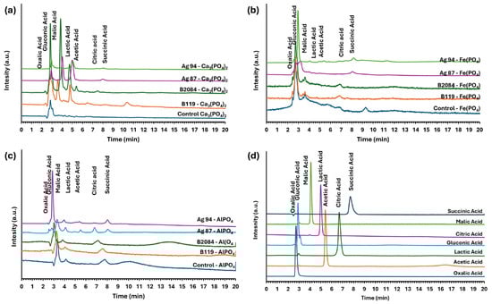 Chromatogram of organic acids produced by bacterial strains (Ag87 (CCT 8090), Ag94 (CCT 8108), B119, and B2084) cultured in National Botanical Research Institute’s Phosphate (NBRIP) growth medium supplemented with three phosphorus sources: (a) Ca3(PO4)2; (b) FePO4; (c) AlPO4; and (d) organic acid standards.