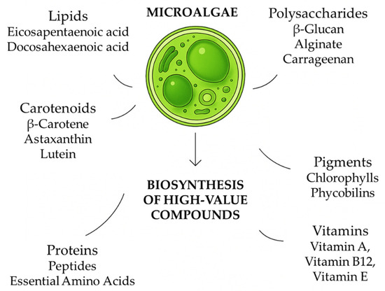Bioactive molecules are chemical substances present in foods consumed by humans. These molecules have the ability to modulate the metabolic processes of organisms that acquire them in their diet. High-value bioactive substances are a large group of compounds (carotenoids, polyphenols, polysaccharides, peptides, vitamins, etc.) with different chemical structures (hydrophilic or lipophilic), found at varying of concentrations both in food and in the human body, specific to each species, widely distributed in nature, with different mechanisms of action and effectiveness against free radicals. The bioactive compounds predominantly present in microalgae include carotenoids (such as β-carotene and astaxanthin), polyunsaturated fatty acids (PUFAs) such as docosahexaenoic acid (DHA) and eicosapentaenoic acid (EPA), as well as polysaccharides such as β-glucan (Figure 1). In recent years, biotechnology applied to microalgae has gained increasing importance. Bioactive molecules extracted from microalgae have a wide range of applications, ranging from biomass production for human and animal feed to the development of environmental solutions and pharmaceutical research [11].