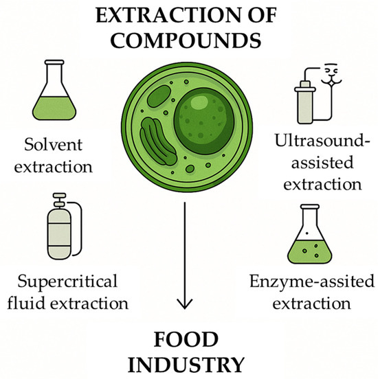 In particular, the development of simpler and more cost-efficient extraction protocols is considered a priority. In this regard, efforts should focus on establishing methodologies that enable the direct use of raw biomass or require minimal pre-treatment. Emerging technologies such as enzyme-assisted extraction, ultrasound, and the use of supercritical fluids are emerging as promising tools to enhance their application on an industrial scale. The integrated use of microalgae represents a promising strategy to address global challenges related to nutrition, energy, and the environment. In this context, the commercialization of microalgae-based products has grown significantly in recent years, driven by increasing consumer interest in sustainable and nutritious alternatives. Nonetheless, the industrial use of microalgae remains fragmented and lacks standardization, which limits broader market integration. Despite growing commercial interest, their application remains largely confined to high-value niche markets, likely due to low production yields and high processing costs. However, progress in scaling up cultivation systems, optimizing biomass processing, and implementing integrated biorefinery approaches, along with a better understanding of the factors influencing the production of bioactive compounds, could enhance the value chain soon.